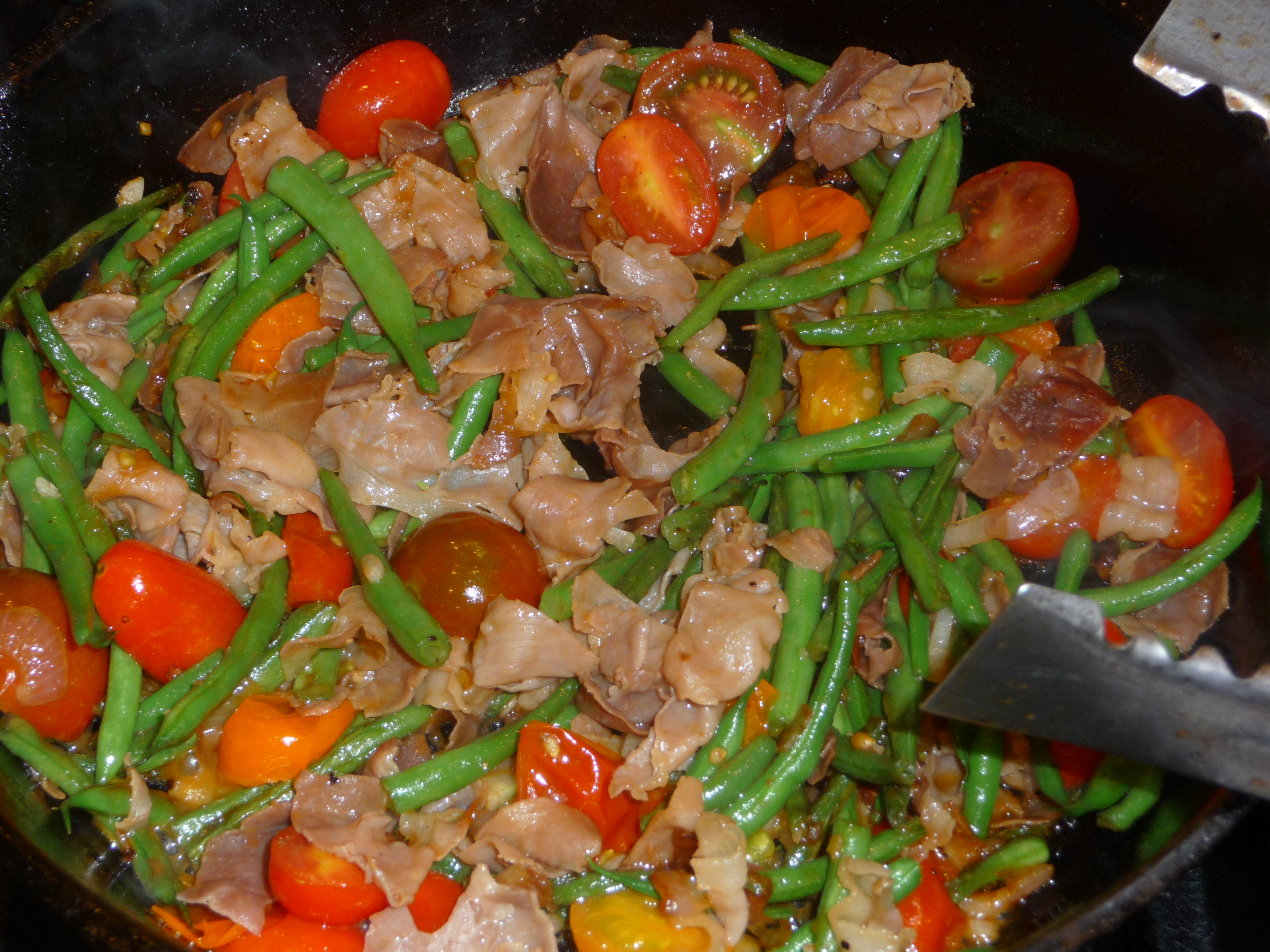After we’ve eaten beans those three ways, I go on to hunt for new recipes — or at least creatively (and deliciously of course) try to use up what other potential ingredients I have hanging around in the frig. The other day, I had some leftover slices of prosciutto that I chopped threw into the frying pan along with the beans, tomatoes, shallot and basil. Sort of on the order of old-fashioned beans stewed with a ham hock, but crisper, quicker, healthier (I’m assuming) and MUCH better tasting.